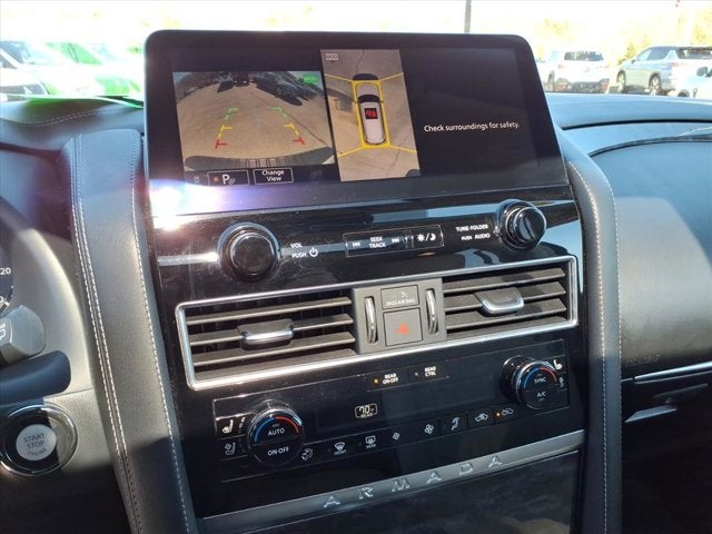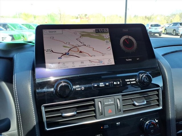 4WD, 13 Speakers, 2.94 Axle Ratio, 3rd Row Carpeted Floor Mats - Bench Seat, 3rd row seats: split-bench, 4-Wheel Disc Brakes, A/V remote, ABS brakes, Air Conditioning, Alloy wheels, AM/FM radio: SiriusXM, Anti-whiplash front head restraints, Auto High-beam Headlights, Auto tilt-away steering wheel, Auto-dimming door mirrors, Auto-dimming Rear-View mirror, Auto-leveling suspension, Automatic temperature control, Brake assist, Bumpers: body-color, Climate-Controlled Front Bucket Seats, Delay-off headlights, Driver door bin, Driver vanity mirror, Dual front impact airbags, Dual front side impact airbags, Electronic Stability Control, Emergency communication system: NissanConnect Services, Exterior Parking Camera Rear, Four wheel independent suspension, Front anti-roll bar, Front Bucket Seats, Front Center Armrest, Front dual zone A/C, Front fog lights, Front reading lights, Fully automatic headlights, Garage door transmitter: HomeLink, Headphones, Heated door mirrors, Heated front seats, Heated rear seats, Heated steering wheel, Illuminated entry, Leather Shift Knob, Low tire pressure warning, Memory seat, Navigation System, NissanConnect featuring Apple CarPlay and Android Auto, Occupant sensing airbag, Outside temperature display, Overhead airbag, Overhead console, Panic alarm, Passenger door bin, Passenger vanity mirror, Power door mirrors, Power driver seat, Power Liftgate, Power moonroof, Power passenger seat, Power steering, Power windows, Quilted Leather Seat Trim, Radio: NissanConnect w/SiriusXM, Rain sensing wipers, Rear air conditioning, Rear anti-roll bar, Rear reading lights, Rear seat center armrest, Rear window defroster, Rear window wiper, Reclining 3rd row seat, Remote keyless entry, Security system, Speed control, Speed-sensing steering, Speed-Sensitive Wipers, Split folding rear seat, Spoiler, Steering wheel memory, Steering wheel mounted audio controls, Tachometer, Telescoping steering wheel, Tilt steering wheel, Traction control, Trip computer, Turn signal indicator mirrors, Variably intermittent wipers, Ventilated front seats, Voltmeter, and Wheels: 22 Machine-Faced w/Tinted Clear Coat.