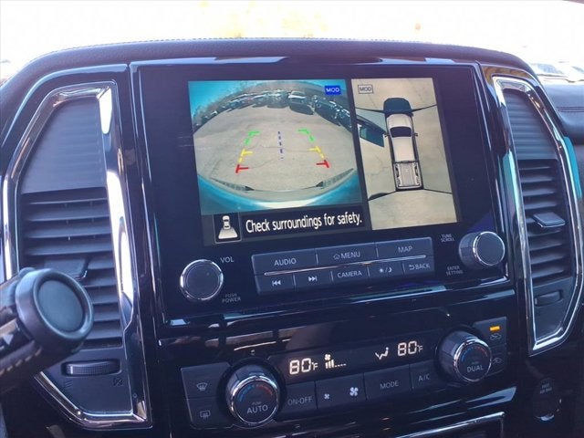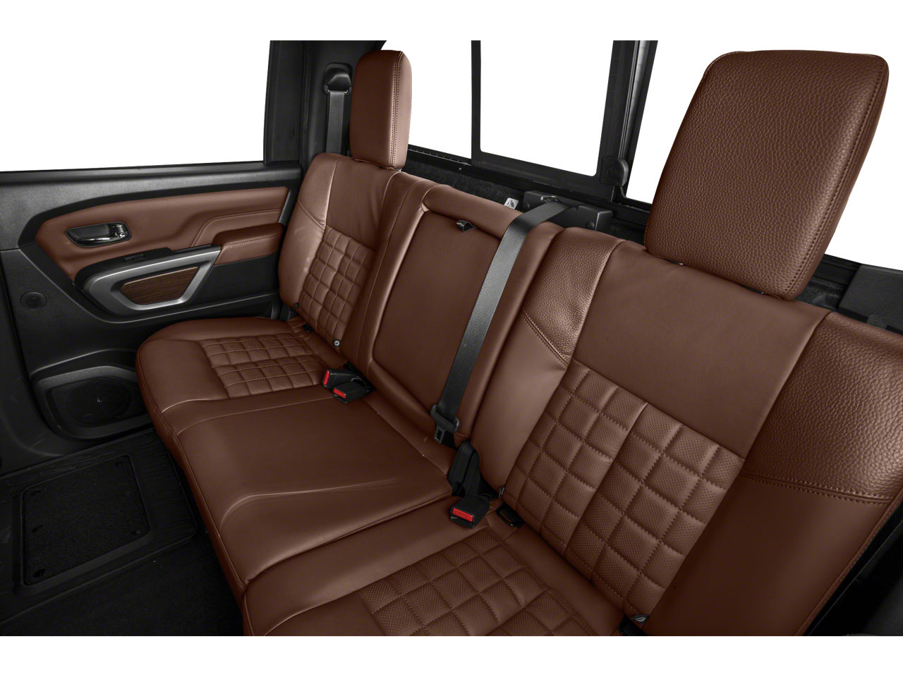 Moonroof Package, Off Road Protection Package (All Season Floor Mats), Platinum Reserve Utility Package, Platinum Utility Package (TITAN Box), Nissan Certified Certified, 4WD, 12 Speakers, 3.692 Axle Ratio, 4-Wheel Disc Brakes, ABS brakes, Air Conditioning, Alloy wheels, AM/FM radio: SiriusXM, Auto High-beam Headlights, Auto tilt-away steering wheel, Auto-dimming door mirrors, Auto-dimming Rear-View mirror, Automatic temperature control, Bed Assist Grip, Blind Spot Warning, Brake assist, Compass, Delay-off headlights, Driver door bin, Driver vanity mirror, Dual front impact airbags, Dual front side impact airbags, Electronic Stability Control, Emergency communication system: NissanConnect Services, Exterior Parking Camera Rear, Front anti-roll bar, Front Bucket Seats, Front Center Armrest, Front dual zone A/C, Front fog lights, Front reading lights, Front wheel independent suspension, Fully automatic headlights, Garage door transmitter: HomeLink, Genuine wood dashboard insert, Genuine wood door panel insert, Heated & Cooled Front Captain's Seats, Heated door mirrors, Heated front seats, Heated rear seats, Heated steering wheel, Illuminated entry, Knee airbag, Leather Shift Knob, Leather steering wheel, Lighted Running Boards, Logo Light & Radiant Grille Emblem, Low tire pressure warning, Memory seat, Navigation system: NissanConnect Navigation, NissanConnect featuring Apple CarPlay and Android Auto, NissanConnect Services Powered By SiriusXM, Occupant sensing airbag, Outside temperature display, Overhead airbag, Overhead console, Panic alarm, Passenger door bin, Passenger vanity mirror, Platinum Illuminated Kick Plate, Platinum Reserve Mud Flaps, Power door mirrors, Power driver seat, Power passenger seat, Power steering, Power windows, P