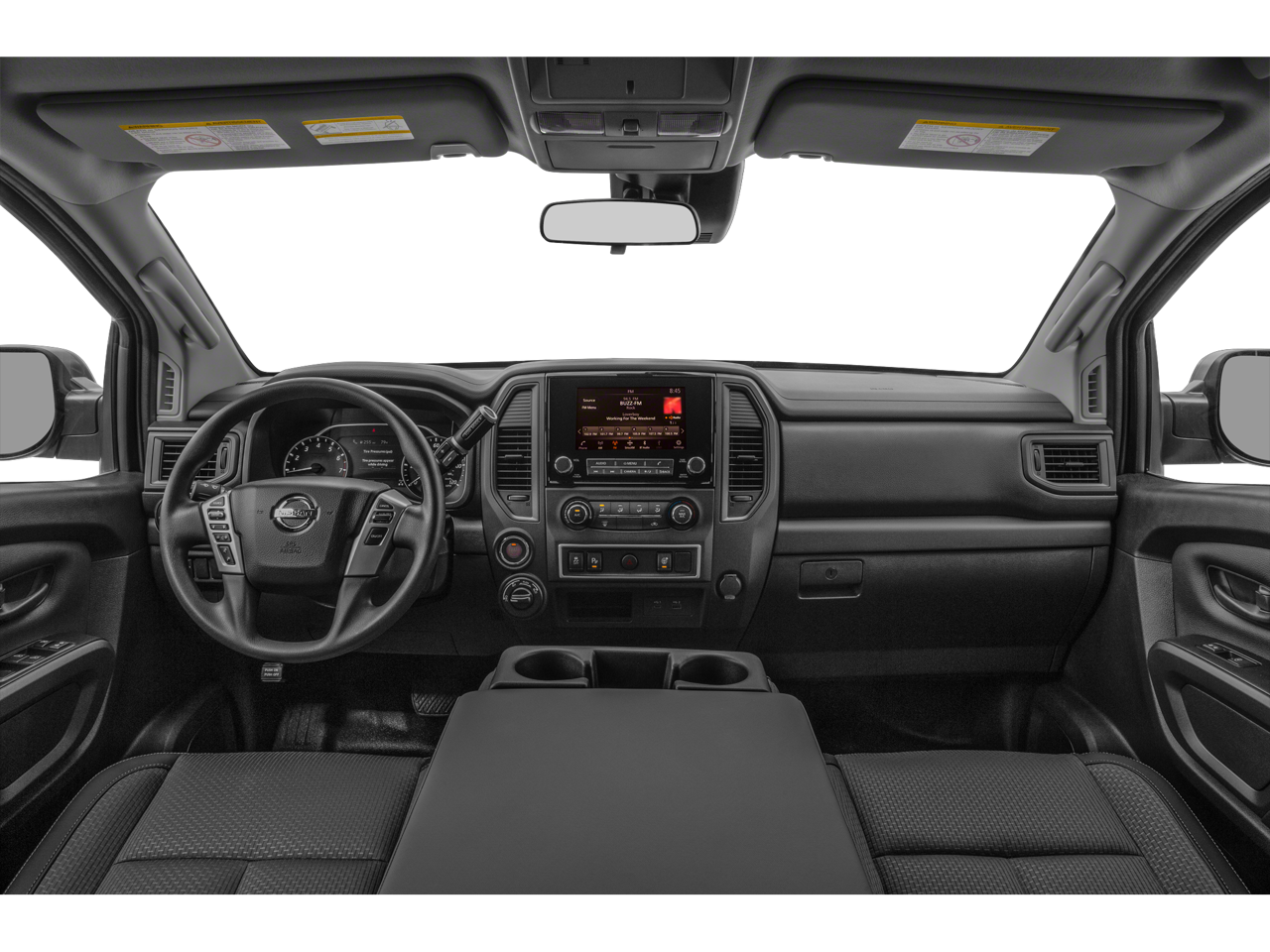 Nissan Certified Certified, 17 Styled Steel Wheels, 4-Wheel Disc Brakes, 4.083 Axle Ratio, 6 Speakers, ABS brakes, Air Conditioning, AM/FM radio: SiriusXM, Auto High-beam Headlights, Blind Spot Warning, Brake assist, Cloth Seat Trim w/Vinyl Bolster, Driver door bin, Dual front impact airbags, Dual front side impact airbags, Electronic Stability Control, Front anti-roll bar, Front Center Armrest w/Storage, Front Manual Split Bench Seat (40/20/40), Front wheel independent suspension, Fully automatic headlights, Illuminated entry, Knee airbag, Low tire pressure warning, NissanConnect featuring Apple CarPlay and Android Auto, Occupant sensing airbag, Outside temperature display, Overhead airbag, Overhead console, Panic alarm, Passenger door bin, Passenger vanity mirror, Power steering, Power windows, Radio data system, Radio: NissanConnect AM/FM, Rear anti-roll bar, Rear Parking Sensors, Rear seat center armrest, Rear step bumper, Rear window defroster, Remote keyless entry, Security system, Speed control, Speed-sensing steering, Speed-Sensitive Wipers, Split folding rear seat, Steering wheel mounted audio controls, Tachometer, Telescoping steering wheel, Tilt steering wheel, Traction control, and Variably intermittent wipers.