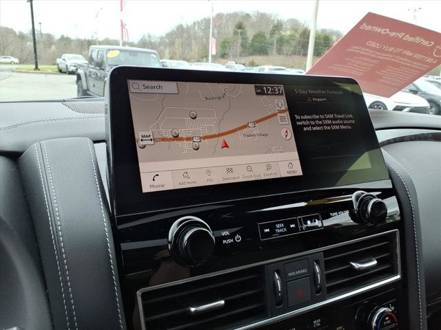 Captain's Chairs Package (2nd Row Captain's Chairs and 2nd Row Center Console w/Padded Armrest), Cargo Package, Nissan Certified Certified, 4WD, 13 Speakers, 2.937 Axle Ratio, 3rd Row Carpeted Floor Mats - Captain Seat, 3rd row seats: split-bench, 4-Wheel Disc Brakes, ABS brakes, Air Conditioning, Alloy wheels, AM/FM radio: SiriusXM, Anti-whiplash front head restraints, Auto High-beam Headlights, Auto tilt-away steering wheel, Auto-dimming door mirrors, Auto-dimming Rear-View mirror, Auto-leveling suspension, Automatic temperature control, Brake assist, Bumpers: body-color, Climate-Controlled Front Bucket Seats, Delay-off headlights, Driver door bin, Driver vanity mirror, Dual front impact airbags, Dual front side impact airbags, Electronic Stability Control, Emergency communication system: NissanConnect Services, Exterior Parking Camera Rear, Four wheel independent suspension, Front anti-roll bar, Front Bucket Seats, Front Center Armrest, Front dual zone A/C, Front fog lights, Front reading lights, Fully automatic headlights, Garage door transmitter: HomeLink, Heated door mirrors, Heated front seats, Heated rear seats, Heated steering wheel, HVAC memory, Illuminated entry, Illuminated Kick Plates, Illuminated Scuff Plate, Knee airbag, Leather Shift Knob, Leather steering wheel, Low tire pressure warning, Memory seat, Navigation System, Nissan USB Charging Cable Set, Occupant sensing airbag, Outside temperature display, Overhead airbag, Overhead console, Panic alarm, Passenger door bin, Passenger vanity mirror, Power door mirrors, Power driver seat, Power Liftgate, Power moonroof, Power passenger seat, Power steering, Power windows, Quilted Leather Seat Trim, Radio: NissanConnect w/SiriusXM, Rain sensing wipers, Rear air conditioning, Rear anti-roll bar, Rear rea