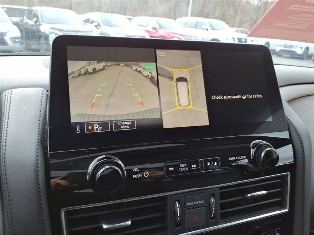 Captain's Chairs Package (2nd Row Captain's Chairs and 2nd Row Center Console w/Padded Armrest), Nissan Certified Certified, 4WD, 13 Speakers, 2.937 Axle Ratio, 3rd Row Carpeted Floor Mats - Captain Seat, 3rd row seats: split-bench, 4-Wheel Disc Brakes, ABS brakes, Air Conditioning, Alloy wheels, AM/FM radio: SiriusXM, Anti-whiplash front head restraints, Auto High-beam Headlights, Auto tilt-away steering wheel, Auto-dimming door mirrors, Auto-dimming Rear-View mirror, Auto-leveling suspension, Automatic temperature control, Brake assist, Bumpers: body-color, Delay-off headlights, Driver door bin, Driver vanity mirror, Dual front impact airbags, Dual front side impact airbags, Electronic Stability Control, Emergency communication system: NissanConnect Services, Exterior Parking Camera Rear, Four wheel independent suspension, Front anti-roll bar, Front Bucket Seats, Front Center Armrest, Front dual zone A/C, Front fog lights, Front reading lights, Fully automatic headlights, Garage door transmitter: HomeLink, Heated door mirrors, Heated Front Bucket Seats, Heated front seats, Heated steering wheel, HVAC memory, Illuminated entry, Knee airbag, Leather Shift Knob, Leather steering wheel, Leather-Appointed Seat Trim, Low tire pressure warning, Memory seat, Navigation System, Occupant sensing airbag, Outside temperature display, Overhead airbag, Overhead console, Panic alarm, Passenger door bin, Passenger vanity mirror, Power door mirrors, Power driver seat, Power Liftgate, Power moonroof, Power passenger seat, Power steering, Power windows, Radio: NissanConnect w/SiriusXM, Rear air conditioning, Rear anti-roll bar, Rear reading lights, Rear seat center armrest, Rear window defroster, Rear window wiper, Reclining 3rd row seat, Remote keyless entry, Security system, Speed control, Speed-sensing